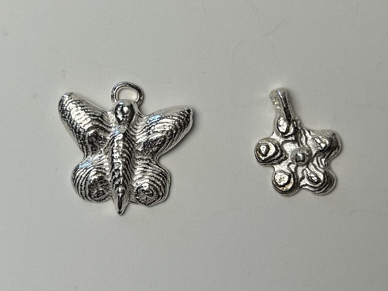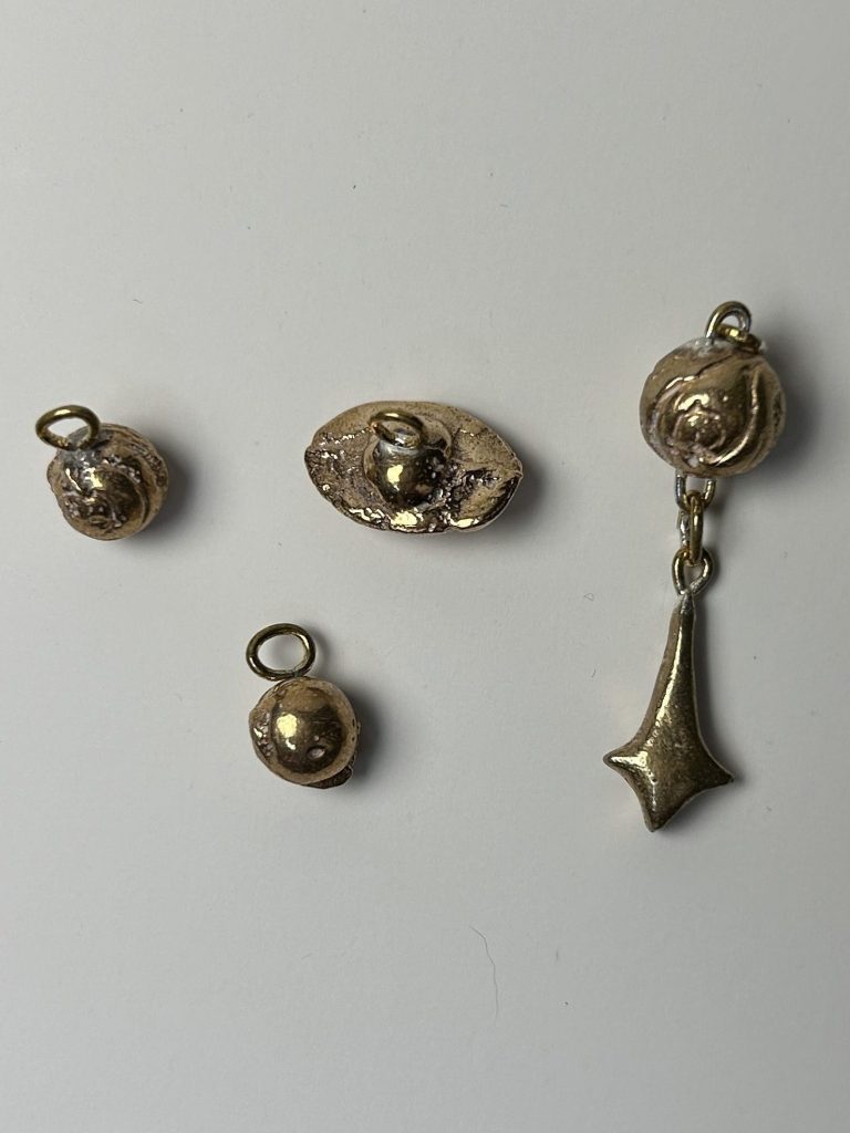 I created this collection of charms through gravity casting. The sterling silver charms are made from cuttlefish carvings, while the ancient bronze charms are sandcast from polymer clay sculpts.