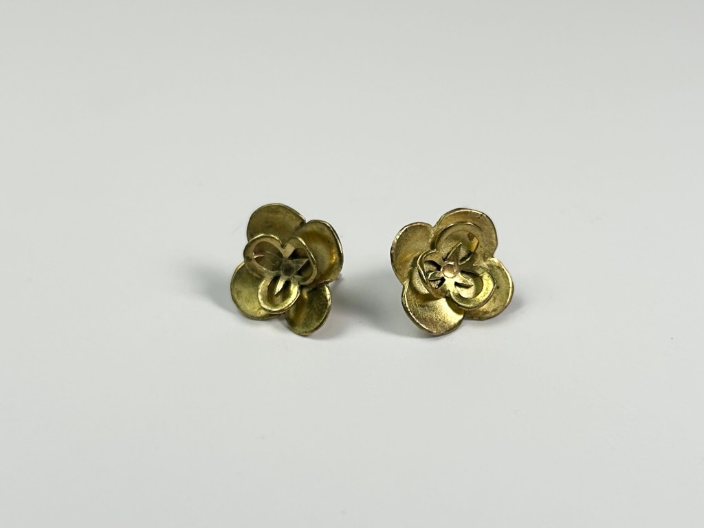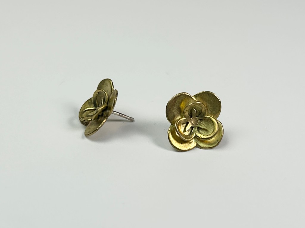 I conceptualized and assembled these hydrangea earrings through piercing and dapping brass. The petal components were riveted together and then soldered onto sterling silver earring posts.