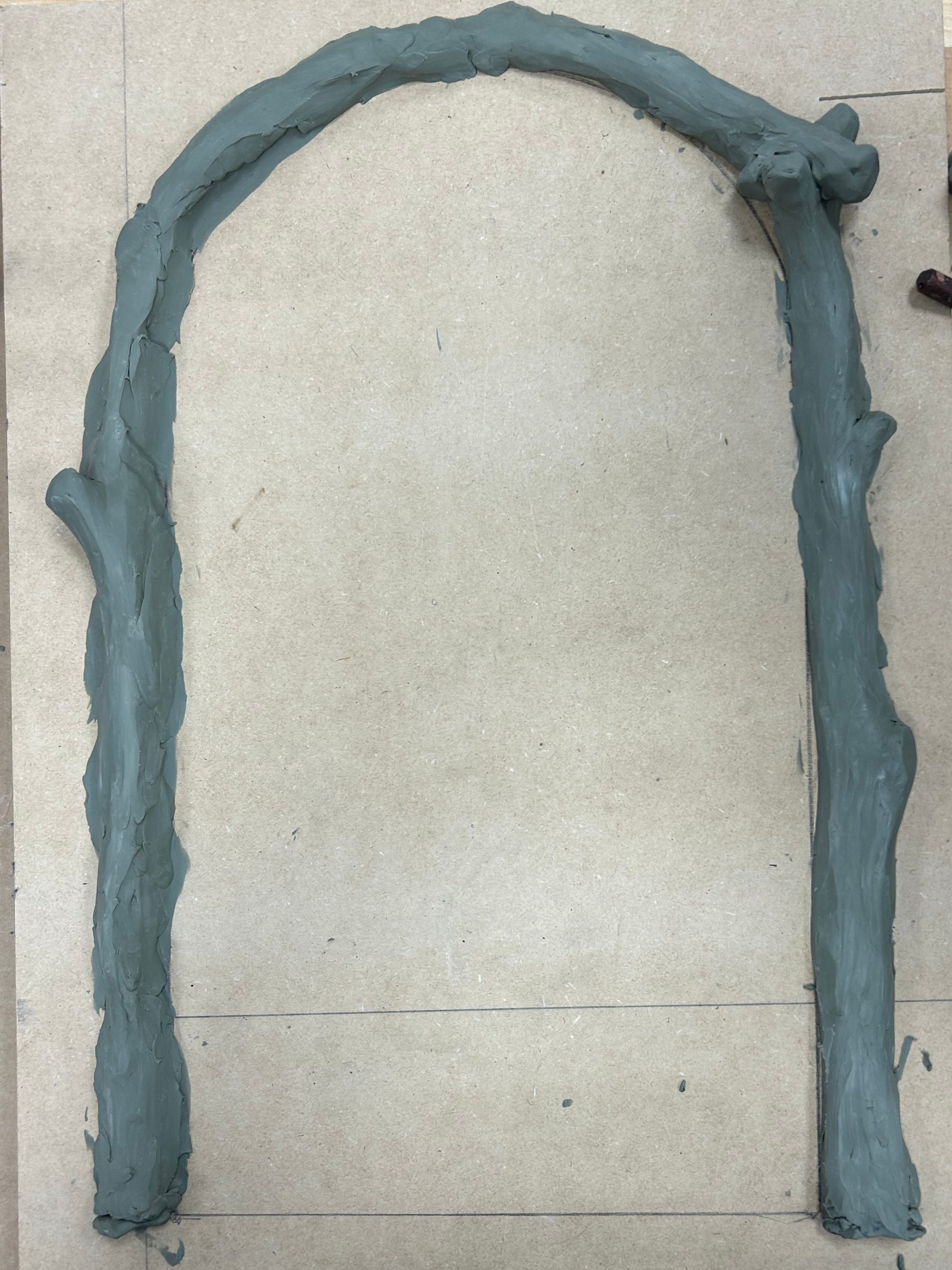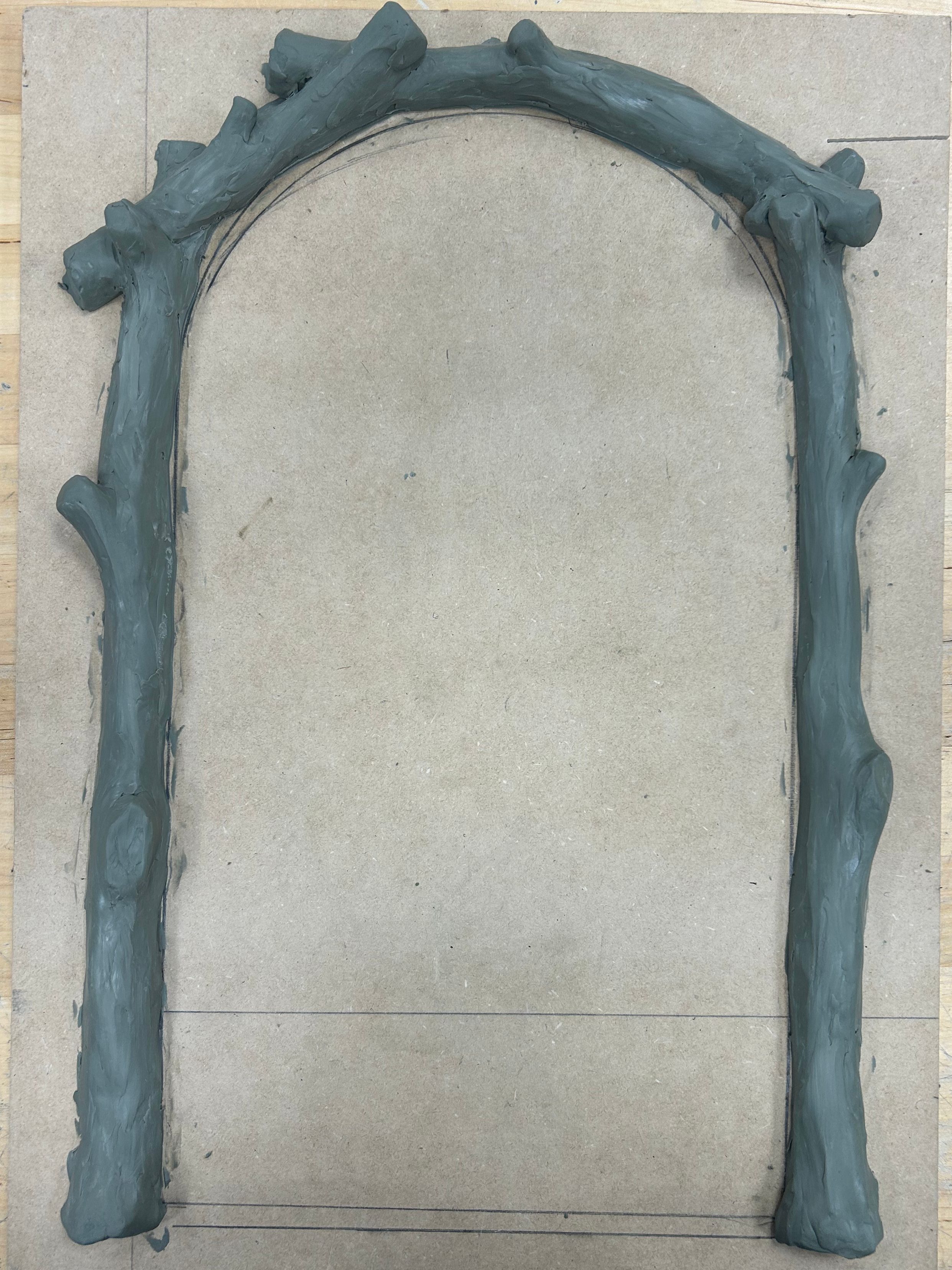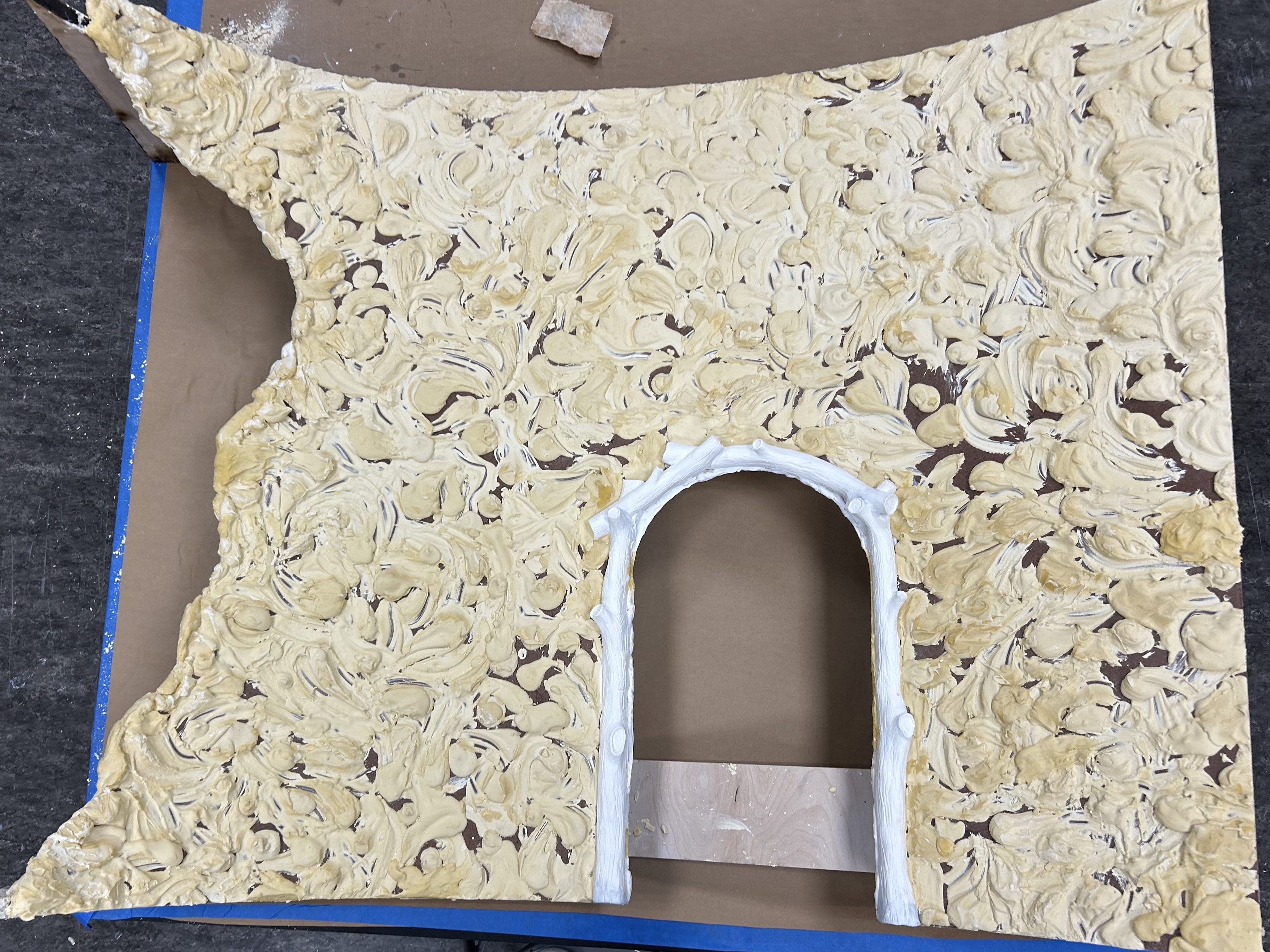 The door frame was first sculpted in chavant clay to resemble various logs, then was made into a silicone mold, cast in plastic, and glued to the masonite wall.