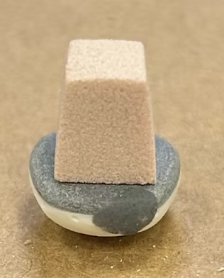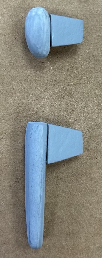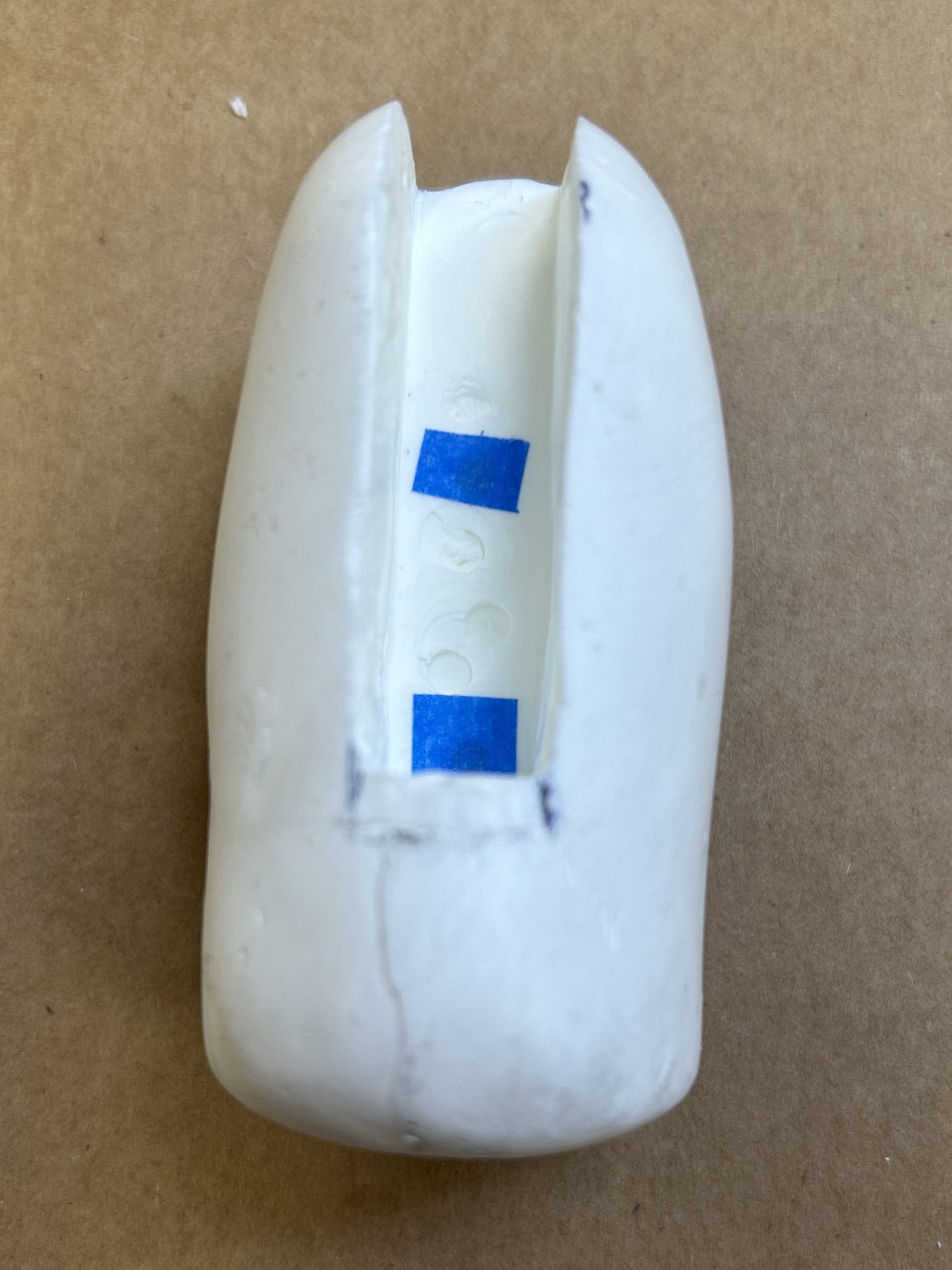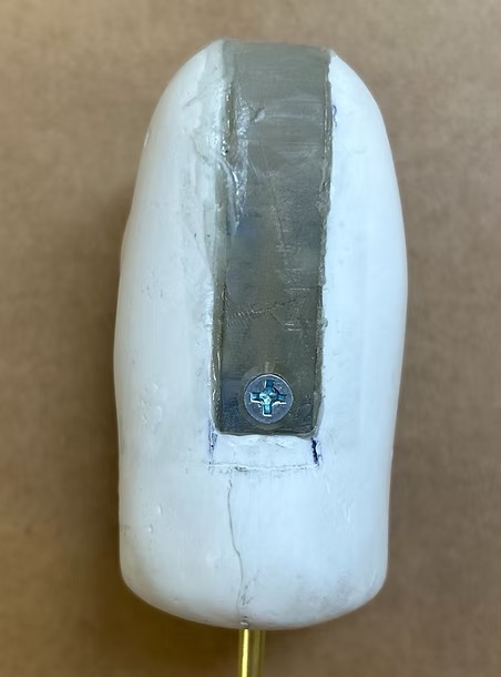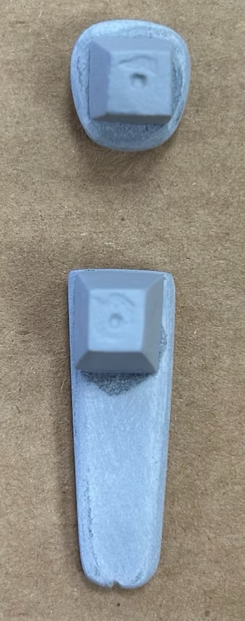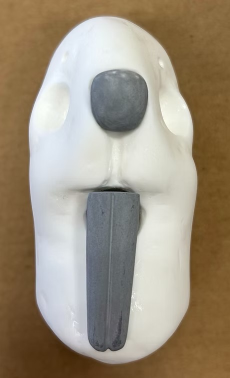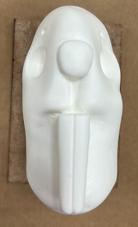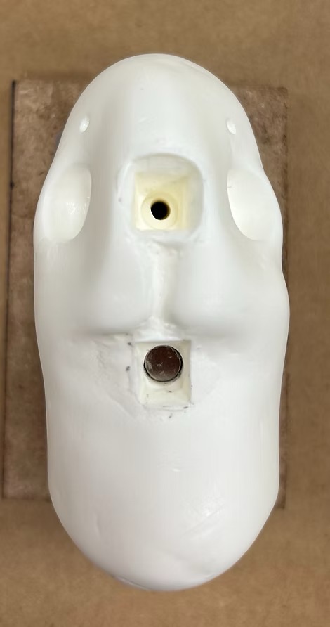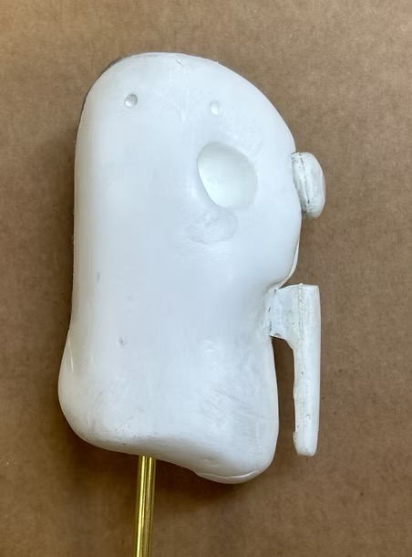 I fabricated keys for the facial features of the puppet to key into the head. Using polyurethane foam, I carved trapezoidal prisms small enough to hide behind facial features, then attached them to a plastic cast of the nose and a proproxy sculpt of the teeth and created two-part molds for each. From there, I cast plastic features and used them to make the key in the plastic head, then remolded the head with the new keys.
