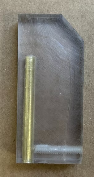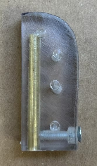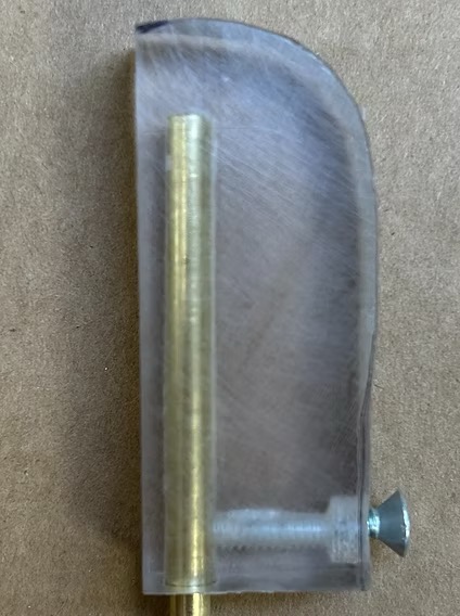 I fabricated a rig for the head of the puppet to move up and down for better movement and expression. It is polycarbonate cut to fit in a key in the plastic head with a brass tube to tension to the neck wire with a set screw to hold it in place.