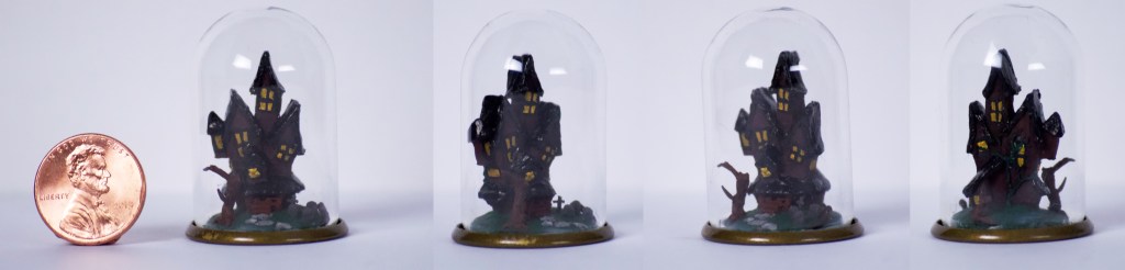I created a miniature model of a haunted house. Included in the sculpture is a dead tree and a graveyard outside the house. All of the sculpture is encased in a small glass display. Some of the details are painted with acrylic paint.