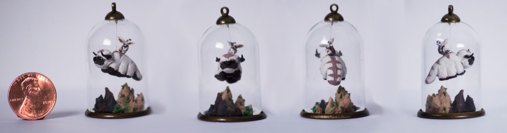 I crafted this miniature model of two characters from the TV show Avatar: The Last Airbender that aired on Nickelodeon. The characters depicted are Appa and Momo. Momo is riding Appa over a landscape. All of the sculpture is encased in a small glass display. Some of the details are painted with acrylic paint.