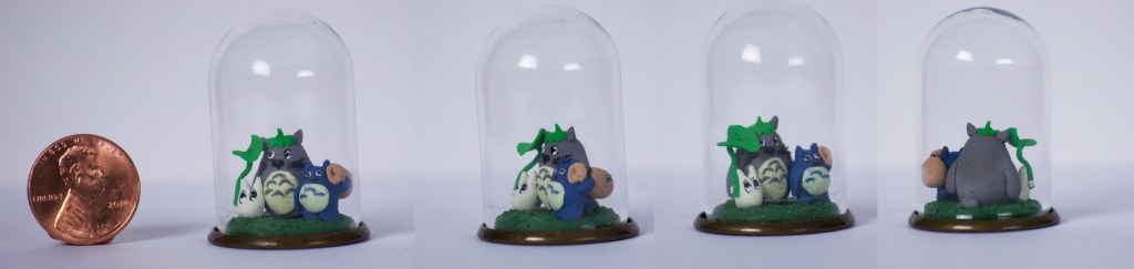 I made this miniature model of three characters from the movie My Neighbor Totoro by Studio Ghibli. The characters depicted are Totoro and his friends. All of the sculpture is encased in a small glass display. Some of the details are painted with acrylic paint.