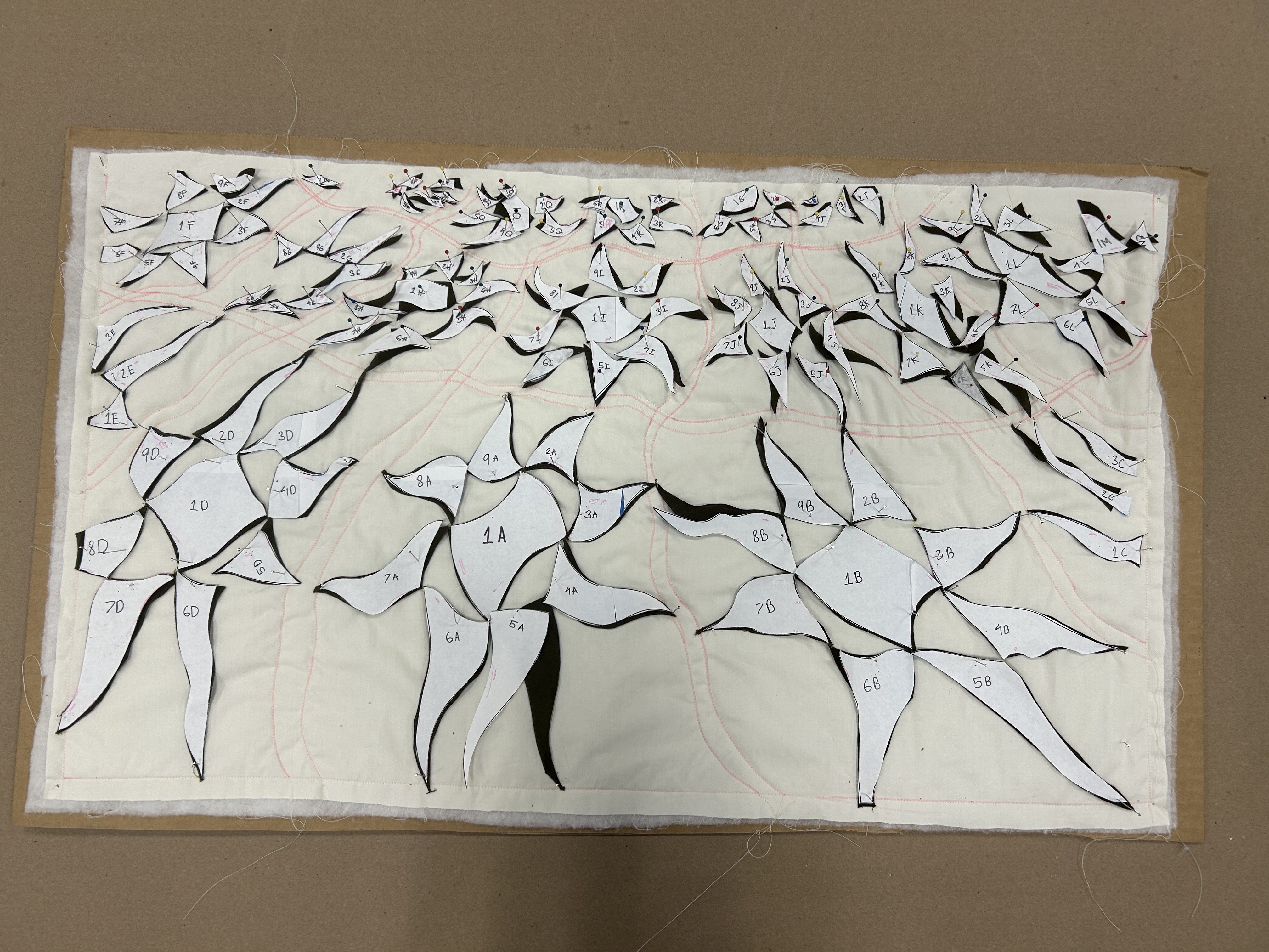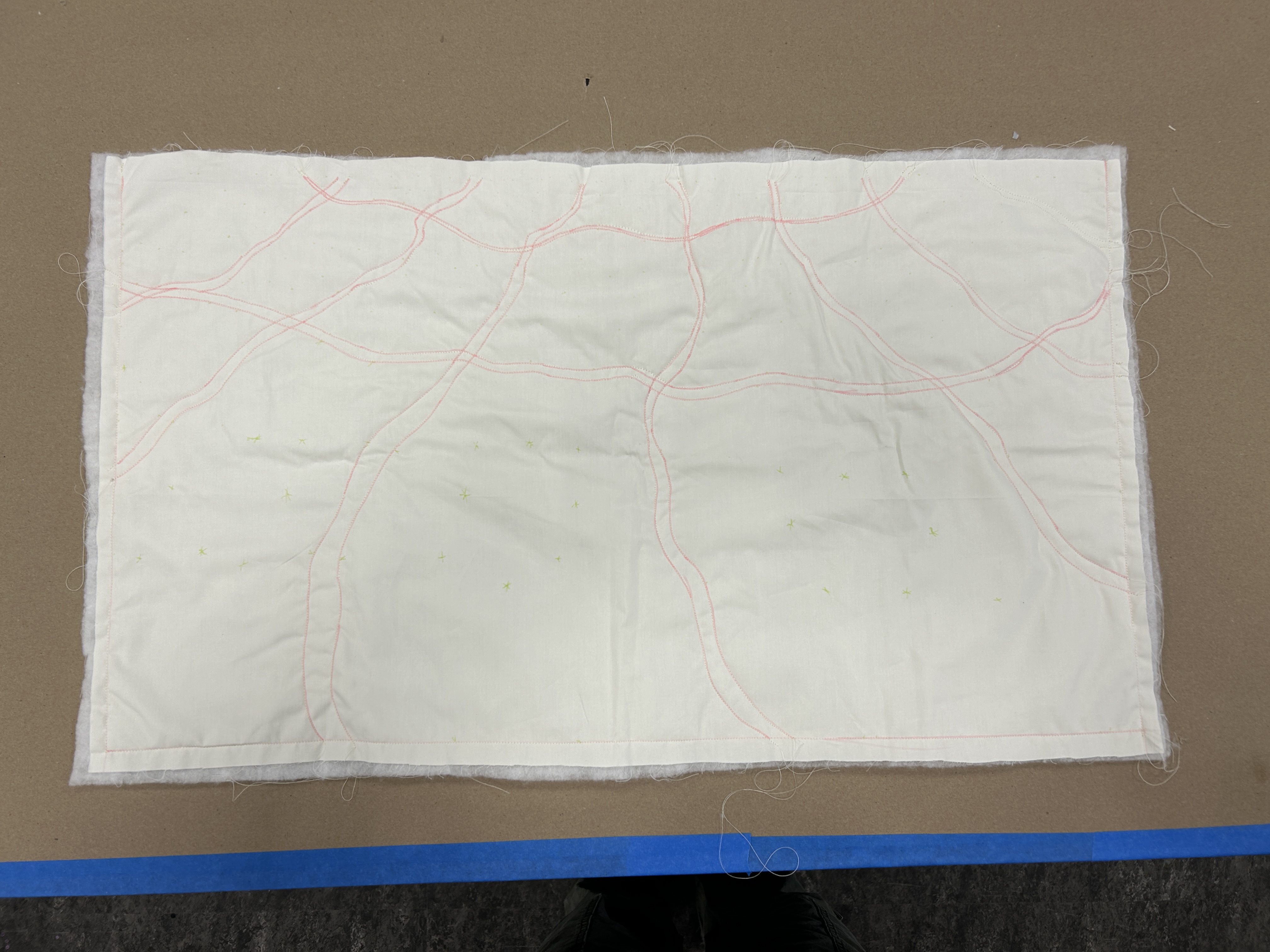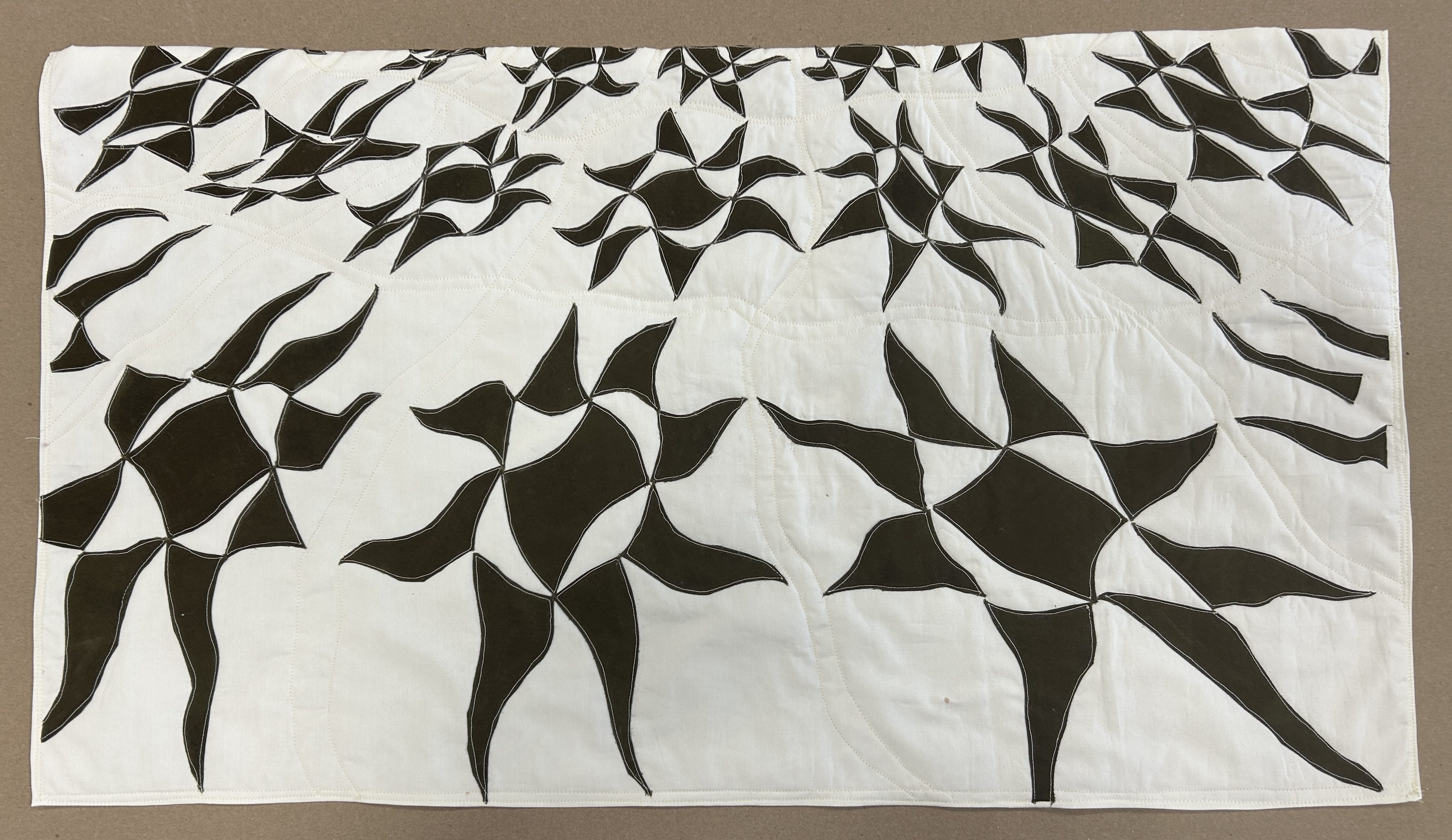 I started by taking the pattern for the linework onto the fabric, then I sewed the fabric to a quilt backing to get the look of a quilt. The quilt was designed to be in a forced perspective, so the pattern got smaller as it was farther from the camera.