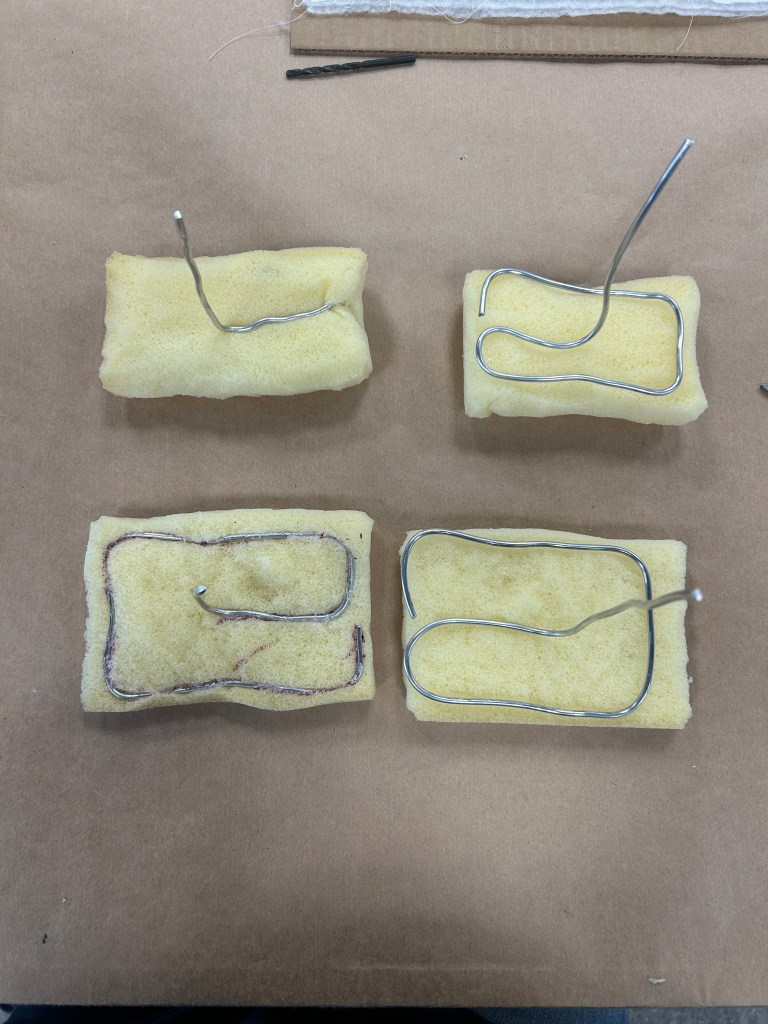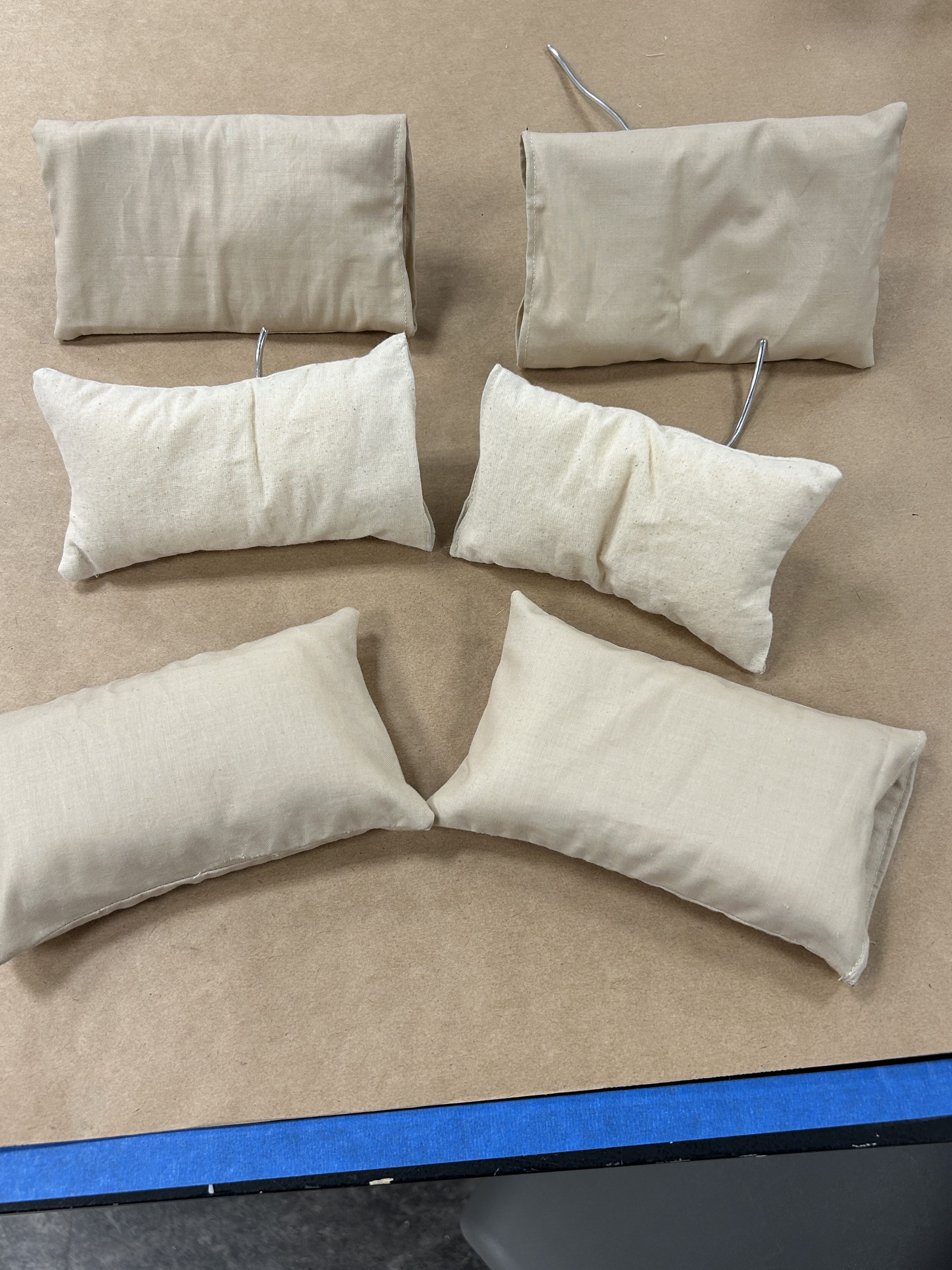 I constructed 4 upholstery foam pillows with 1/8″ wire rigging so the pillows could be posable and anmiatable. I also made pillows cased with 28-gauge wire, lining the openings so the cases could also be posed. And I make a stand for the pillows to attach to.