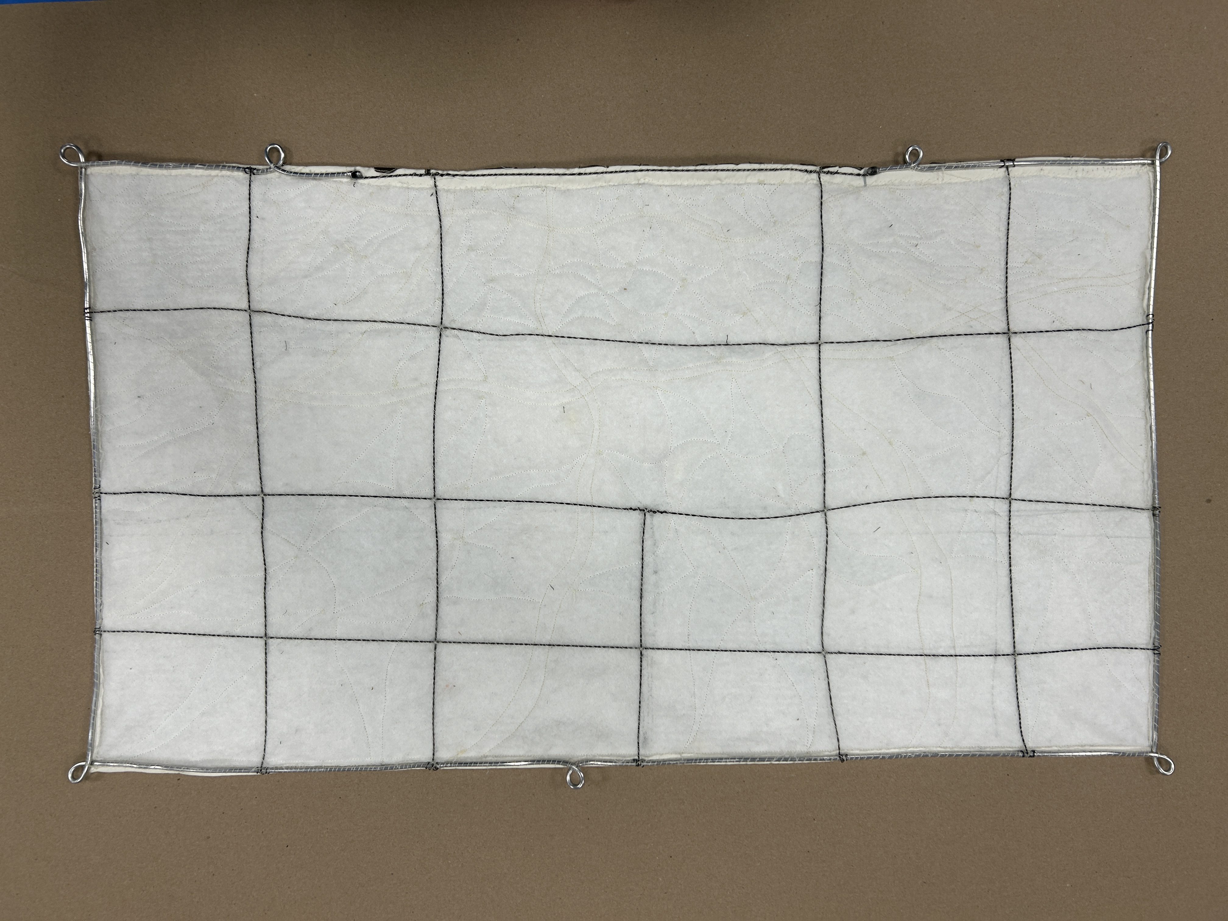 I used 1/8″ wire with loops on the corners and other points where we want to have a strong contact with the quilt. This frame was completed with a triple twist of 28-gauge wire along the top edge where the puppets would be. This was to allow more flexibility for animation. and a grid of twisted 28-grade wire was placed in the middle of the quilt to control the movement of the motion.