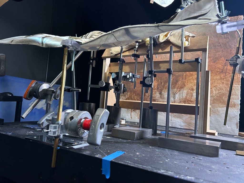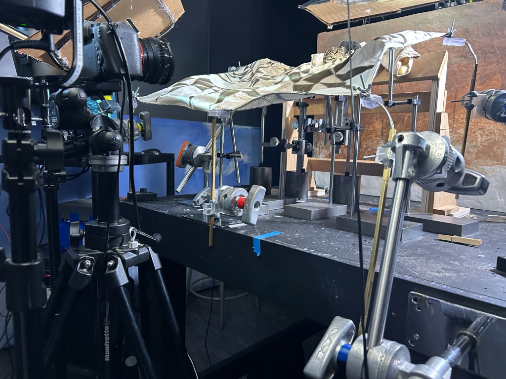 On set, all of the corner loops were grasped tightly with nuts and bolts attached to polycaobaminte blocks on brass square tubes that were held by C-stand arms mounted to the table. This was so it could be posed into the desired framing. The points at the top close to the puppets were attached to a burkey system hardware on rods on weights, as well as two more points of support in the middle of the quilt. These were added for extra support and used small hardware going through the quilt just off the camera.
