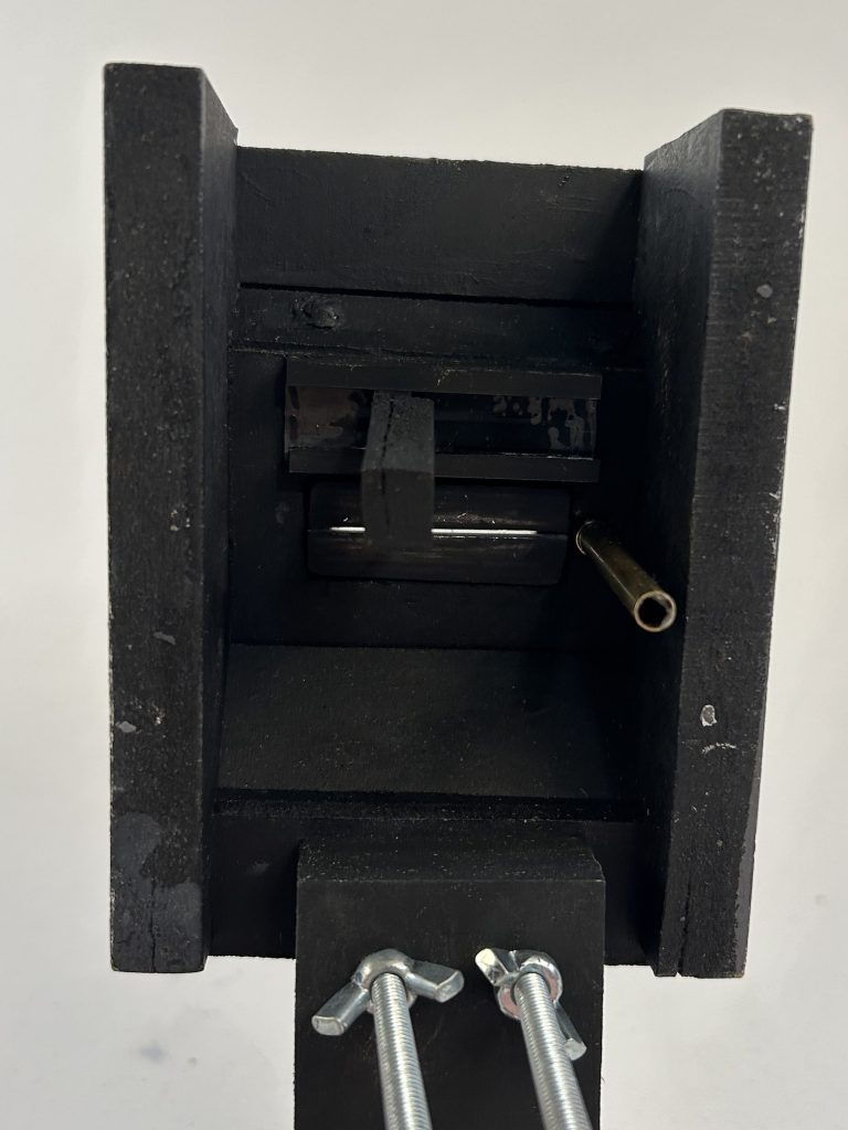This was achieved by creating a small horizontal cut in the acrylic so that a T-shaped wire could pass through and be secured to a base to tension it in place, and for the animators to guide it side to side.