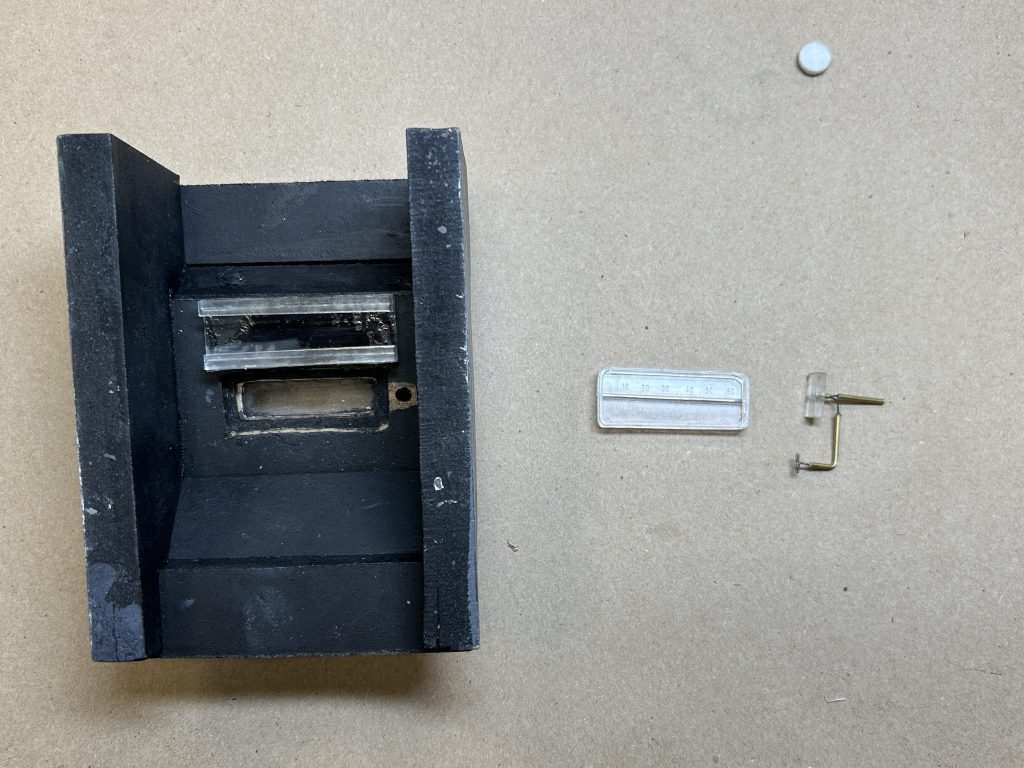 The station window was made by layering a small sheet of PETG in an indent between the MDF base and the top radio panel. Another indent was carved into the back of the base to fit a laser-cut acrylic sheet, which would display the radio channels and house the moving wire for changing stations.